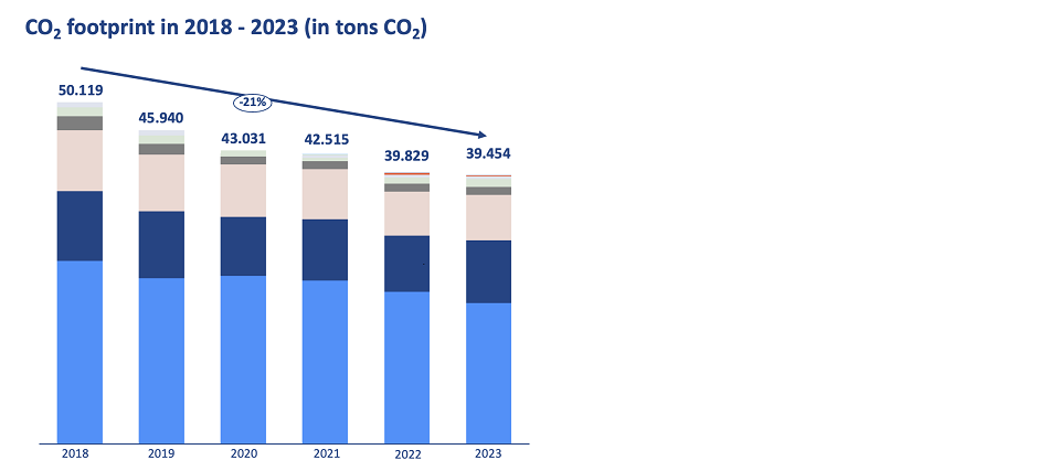 In 2023 our overall CO2 footprint was 39,454 tonnes. This means that we are on schedule when it comes to direct CO2 reduction. Our direct CO2 impact mainly comes from buildings (52%) and commuting (23%).